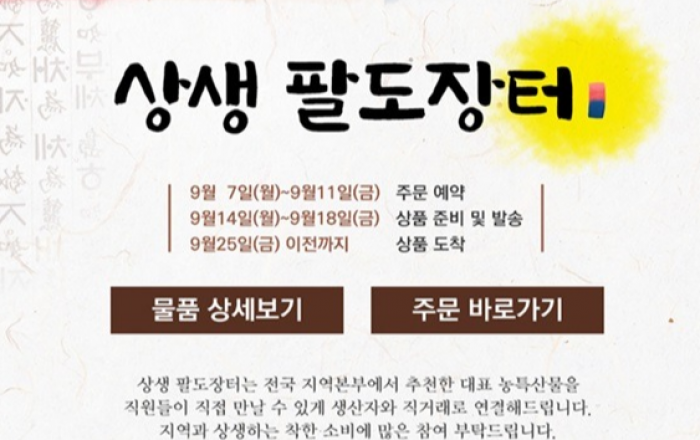 코로나19 장기화로 어려움을 겪고 있는 지역 농가와 상생하고 지역 농특산물 구매 활성화를 위하여 9월 7일부터 11일까지 5일간 비대면 ‘상생 팔도장터’를 개최한다.상생 팔도장터는 전국의 대표 농특산물을 임직원들이 직접 만날 수 있도록 생산자와 소비자를 직거래로 연결해
