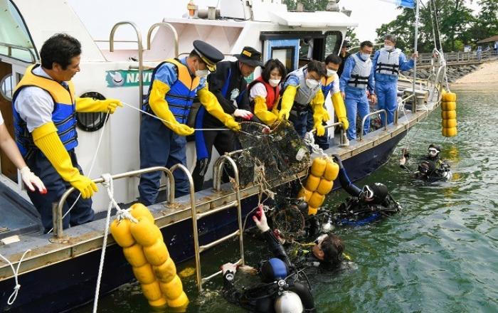 포스코가 29일 광양시 태인동 배알도 수변공원 일원에서 광양시와 함께 코로나19 생활 속 거리두기를 준수하면서 해양환경 정화활동을 펼쳤다.이날 포스코 클린오션봉사단 30여 명은 배알도 해수욕장 내항에서 플라스틱, 폐그물, 폐타이어 등 수중쓰레기 약 1톤과 해적 생물인