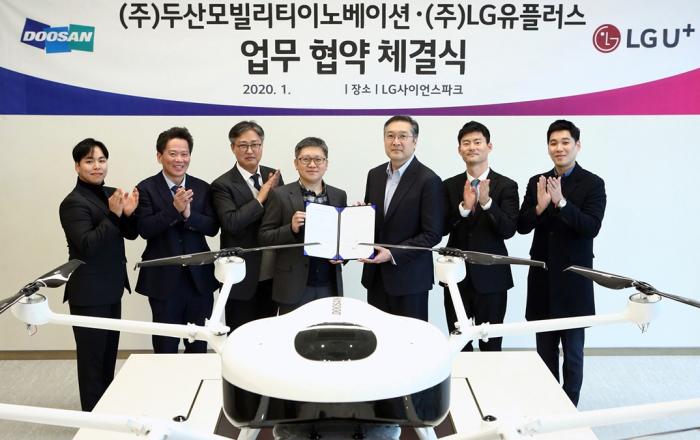 두산모빌리티이노베이션(Doosan Mobility Innovation, 이하 DMI)이 LG유플러스와 손잡고 ‘스마트 수소 드론’ 구현에 나섰다. DMI와 LG유플러스는 지난달 30일 마곡 LG사이언스파크에서 이두순 DMI 대표와 조원석 LG유플러스 기업신사업그룹장이