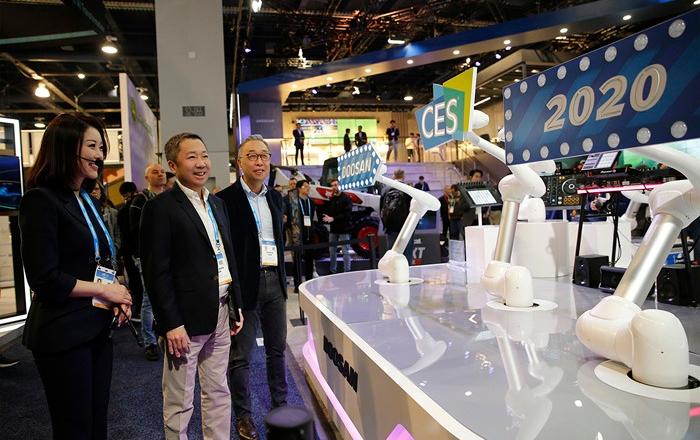 박정원 두산그룹 회장이 8일(현지시간) 박지원 그룹부회장을 비롯한 경영진과 함께 미국 라스베이거스에서 열리고 있는 CES 2020 현장을 찾았다.박 회장은 사우스 홀(South Hall)에 위치한 두산 부스를 시작으로, 센트럴(Central)∙노스(North) 홀을 오