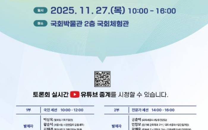 국회의장 직속 국회세종의사당건립위원회(위원장 송재호)와 대통령 직속 지방시대위원회(위원장 김경수)가 공동주최하는 ?국민과 함께 만들어 가는 국회세종의사당? 토론회가 11월 27일(목) 오전 10시 국회박물관에서 개최된다. 이번 토론회는 국회세종의사당 건립