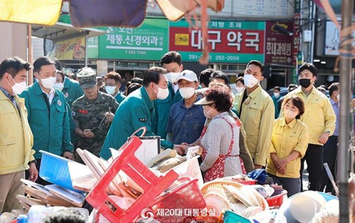 윤석열 대통령은 어제(7일) 제11호 태풍 ‘힌남노’ 피해지역에 대한 사전조사 결과를 토대로 특별재난지역 선포기준을 충족할 것이 확실시 되는 경북 포항시와 경주시에 대해 특별재난지역으로 선포했다. 윤 대통령은 이날 포항·경주 현장 방문을 마치고 서울 용산 대통령실