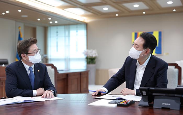 윤석열 대통령은 21일 국민에 개방된 청와대 활용 방안과 관련, “본관과 영빈관 등 청와대 공간이 국민의 복합문화예술 공간이 될 수 있도록 기획해 달라”고 지시했다. 윤 대통령은 이날 오전 서울 용산 대통령실 청사 집무실에서 박보균 문화체육관광부 장관으로부터 부처