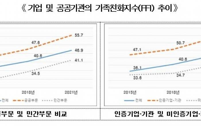 가족친화 인증기업과 기관 수가 꾸준히 늘어나는 가운데 가족친화지수 또한 지속 상승한 것으로 나타났다.여성가족부는 3년마다 공표되는 국가승인통계인 ‘2021년 기업 및 공공기관의 가족친화수준 조사’ 결과를 22일 발표했다.이번 조사는 ‘가족친화사회 환경의 조성 촉진에 관