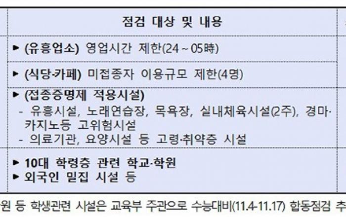 정부는 단계적 일상회복 전환에 따른 방역 긴장감 완화와 해외의 재확산 사례 등을 감안, 초기 감염확산 가능성에 대비해 4일부터 정부합동 특별점검단을 2주간 운영한다.이번 점검은 행안부 등 8개 부처와 지자체가 참여, 서울·경기·인천 등 수도권을 중심으로 중점관리시설 및