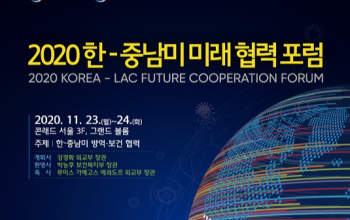 외교부와 보건복지부는 11.23.(월)-24.(화) 이틀간 서울 여의도 콘래드 호텔에서 코로나19 확산 이후 해외 장차관급 고위 인사들이 직접 방한하여 개최되는 최초의 다자 행사인‘2020 한-중남미 미래협력포럼’을 공동으로 개최할 예정이다.대면과 비대면 혼합 방식으로