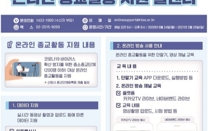 문화체육관광부(이하 문체부)와 과학기술정보통신부(이하 과기정통부)는 코로나19 방역단계 상향(12. 8.)과 5인 이상 집합금지 등 강화 조치(12. 22.)에 따라 당초 올해 12월에 종료할 예정이었던 ‘비대면 온라인 종교활동 지원 사업’을 2개월 연장하기로 결정했다