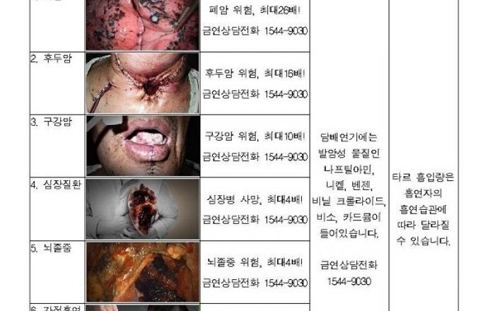 오는 23일부터 담뱃갑 경고그림 12종 중 9종이 바뀐다. 새로운 경고그림이 부착된 담뱃갑은 내년 1월말부터 소매점에서 판매된다. 보건복지부와 한국건강증진개발원은 23일부터 반출되는 모든 담배에 새로운 경고그림과 문구가 표기된다고 21일 밝혔다.24개월마다 담