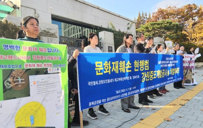 ‘동북공정을 막는 중도유적지키기 시민연대’는 11월 7일 오후 2시 서울 대검찰청 정문 앞에서 ‘강원도 기념물 19호 적석총의 문화재보호구역을 훼손한 〈강원도중도개발공사〉를 구속처벌하라’를 요구하는 기자회견을 열었다.이들 단체는 (이하 GJC)가 강원도 춘천시의 중도(