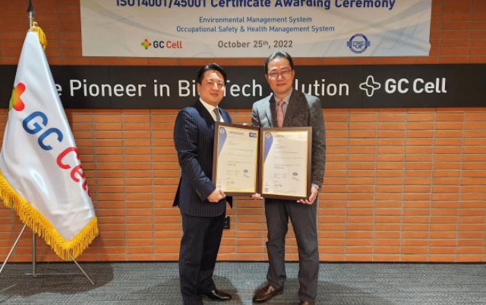 GC셀이 글로벌 공인 인증기관 DQS코리아에서 안전보건 및 환경 경영시스템의 국제 표준인 ‘ISO 45001(안전보건 경영시스템)’과 ‘ISO 14001(환경 경영시스템)’ 인증을 통합 획득했다고 25일 밝혔다.ISO 45001은 국제표준화기구(ISO) 인증 전문 기관