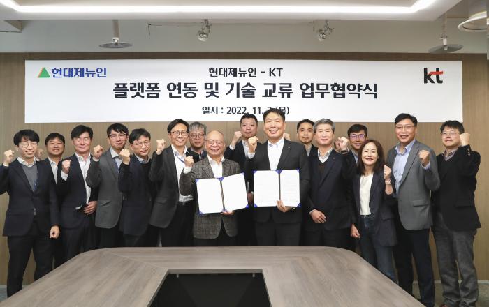 KT가 3일 현대건설기계 분당 사무소에서 현대제뉴인과 ‘상호 플랫폼 연동 및 기술 협력’에 관한 업무협약(MOU)을 체결했다고 4일 밝혔다. 양사는 이번 협약을 통해 건설기계 위치 정보를 활용한 통신 시설물 안정성 강화와 플랫폼 협력을 통한 공동 프로젝트 추진
