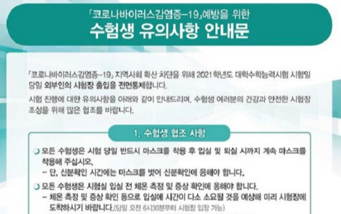 내달 3일 치러지는 대학수학능력시험을 앞두고 코로나19에 확진되거나 자가 격리된 수험생은 관할 교육청에 신고해야 한다.또 수능 전날 진단검사를 희망하는 수험생은 선별진료소가 아닌 가까운 보건소에서 검사를 받아야 한다. 교육부는 25일 2021학년도 대학수학능력시험(이하