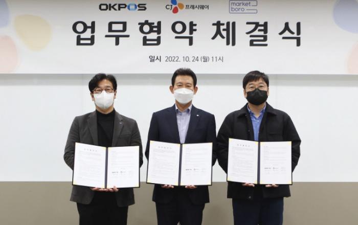 CJ프레시웨이는 24일, 온라인 식자재 구매 활성화를 위해 NICE 그룹 산하의 국내 최대 POS(판매시점관리시스템) 솔루션 1위 기업 오케이포스, 식자재 유통 전문 푸드테크 스타트업 마켓보로와 3자 업무협약을 체결했다.오케이포스는 약 22만 개의 가맹점이 사용 중이며