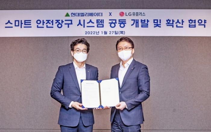 LG유플러스와 현대엘리베이터는 ‘스마트 안전장구 시스템 공동 개발 및 확산 협력’에 관한 업무협약(MOU)을 27일 체결했다. 양사는 엘리베이터를 설치하는 현장에서 IoT센서를 활용해 안전한 작업환경을 만들고, 중대재해 발생을 예방하는 사고 예방 시스템을 만들기로 했다