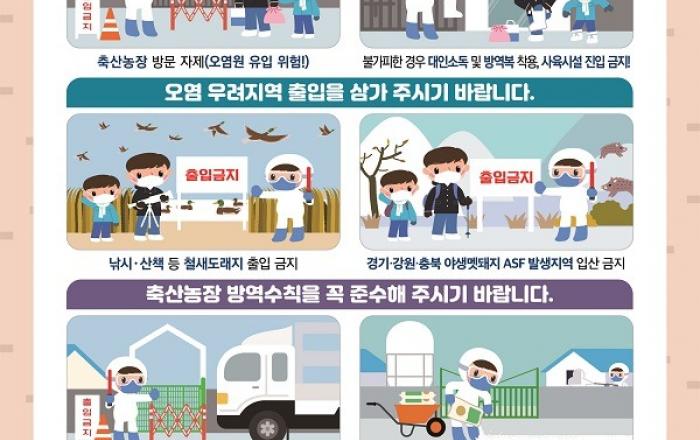 정부가 설 연휴 기간에도 가축 방역에 빈틈이 생기지 않도록 예찰·점검·소독 등 방역 업무를 정상적으로 추진하기로 했다.또 1월 28일부터 2월 3일까지를 ‘전국 일제 소독의 날’로 지정하고 농장과 축산 관계시설, 축산차량을 집중적으로 소독하기로 했다.농림축산식품부는 설
