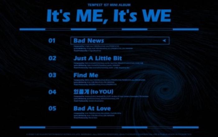 7인조 신예 템페스트(TEMPEST)가 탄탄한 음악적 역량을 선보인다.템페스트(한빈, 형섭, 혁, 은찬, 루, 화랑, 태래)는 21일 0시 공식 SNS를 통해 데뷔 앨범 'It's ME, It's WE(이츠 미, 이츠 위)'의 트랙리스트를 공개했다.트랙리스트에 따르면
