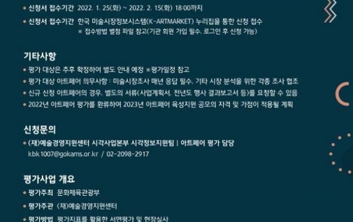 문화체육관광부는 재단법인 예술경영지원센터와 함께 미술전람회(아트페어)를 우리나라 작가와 작품을 조명할 수 있는 종합 플랫폼으로 육성하기로 했다.이에따라 11일부터 올해 미술 전람회를 개최·운영하는 단체 중에 지원 대상을 공모한다.이번 공모는 지난해 문체부가 운영한 ‘아