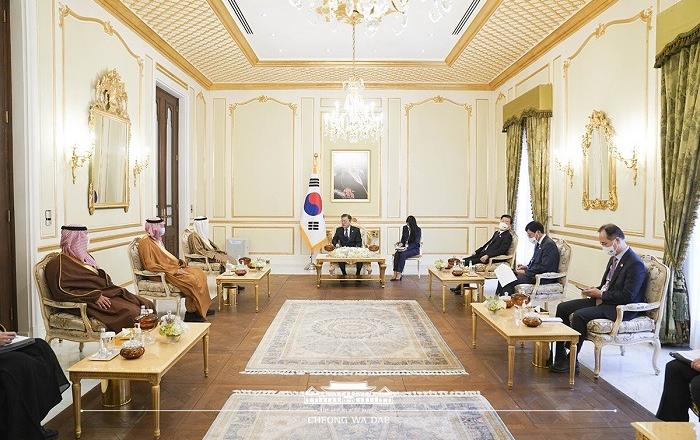 사우디아라비아를 방문 중인 문재인 대통령은 19일(현지시간) 수도 리야드에서 나예프 알 하즈라프 걸프협력회의(GCC) 사무총장을 접견하고 협력 강화 방안 및 FTA 협상 재개 등에 대해 의견을 교환했다고 박경미 청와대 대변인이 서면 브리핑을 통해 전했다.접견에서 문 대