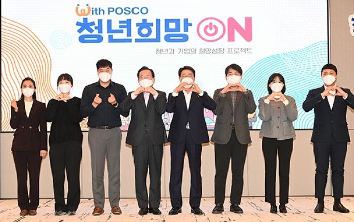 정부와 포스코그룹이 ‘청년희망ON(溫, On-Going)’ 프로젝트 다섯 번째 파트너십을 맺었다.이 자리에서 포스코그룹은 향후 3년간 총 2만 5000개의 일자리 창출을 약속했다. ▲ 김부겸 국무총리(왼쪽 네번째)와 최정우 포스코 회장(오른쪽 네번째) 등 참석자들이 1