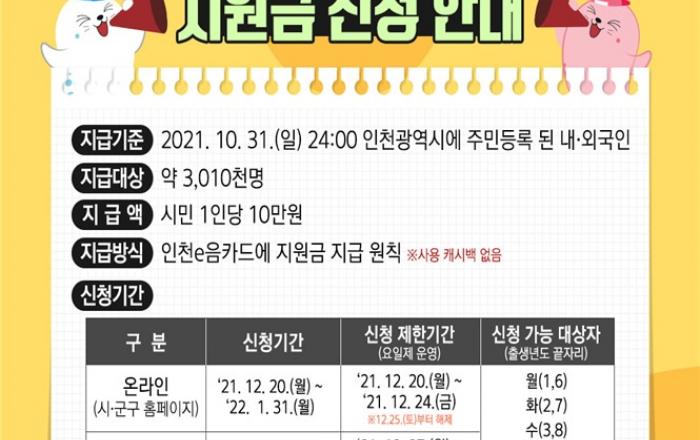 인천시의 재난극복 및 일상회복지원금이 20일부터 순차적으로 지급된다. 인천광역시는“코로나19로 멈춘 인천시민의 일상과 절박한 시민의 어려움을 외면하지 않고 지역경제 회복을 위한 골든타임을 놓치지 않기 위해 시민들에게 재난극복 및 일상회복지원금을 긴급 지원 한다”고 밝혔