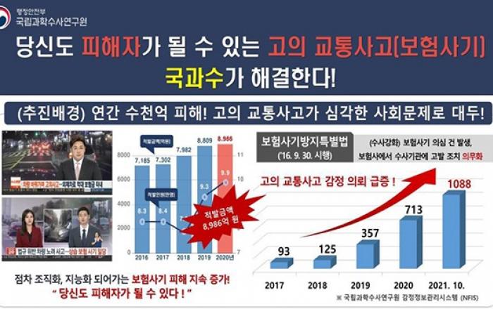 앞으로는 교통사고를 고의적으로 유발해 보험금·합의금을 편취하는 범죄가 어려워지게 된다.행정안전부 국립과학수사연구원은 보험사기를 유발하는 운전자의 행동 특성에 대한 연구개발 등을 통해 피의자의 ‘고의성을 과학적으로 입증’ 할 수 있는 시스템을 구축했다고 밝혔다.특히 국과