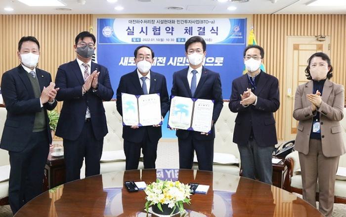 한화건설 최광호 부회장(왼쪽에서 세번째)과 허태정 대전시장(왼쪽에서 네번째)을 비롯한 양측 관계자들이 대전하수처리장 시설현대화 민간투자사업의 실시협약을 체결하고 기념사진을 촬영하고 있다.이번 실시협약을 통해 한화건설을 대표사로 하는 대전엔바이로㈜는 기존의 원촌동 하수처