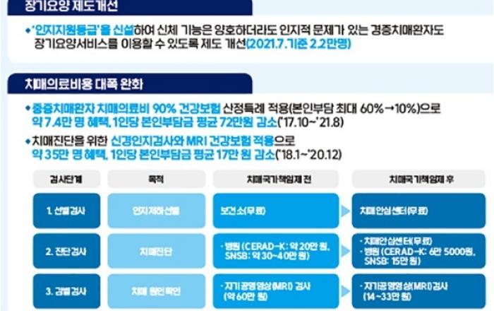 정부가 지난 4년간 추진한 치매국가책임제를 통해 전국 256개 시군구에 치매안심센터가 설치되고 분소 188곳을 운영하면서 약 18만 명이 조기검진으로 치매를 발견했고, 47만 명의 환자가 돌봄 등의 혜택을 이용한 것으로 나타났다.특히 장기요양 비용부담 완화로 31만 명