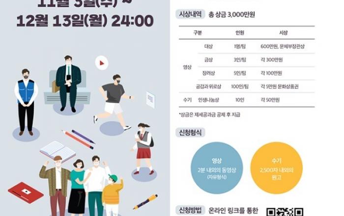 코로나 시대 고마운 사람들, 코로나로 변화한 나만의 출퇴근법, 코로나 위기를 버텨낸 삶의 지혜 등 코로나19 시대를 사는 다양한 모습들을 담은 영상과 수기를 뽑는다.문화체육관광부는 3일 한국문화예술위원회와 함께 이같은 내용의 ‘문화백신 공모전’을 다음달 13일까지 연다