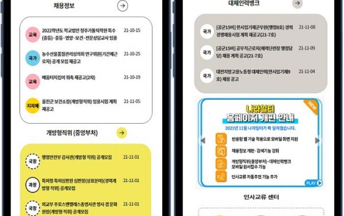 공무원 일자리 정보를 제공하는 ‘나라일터(gojobs.go.kr)’ 서비스를 모바일로도 이용할 수 있게 된다.인사혁신처는 공직 채용정보와 공무원 인사교류 등을 통합 관리하는 온라인 시스템 ‘나라일터’를 모바일 체계로 전면 개편해 17일 서비스를 시작한다고 밝혔다.▲ 모