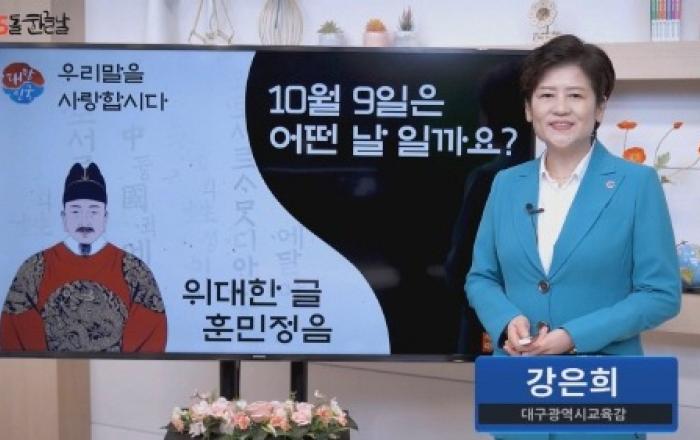 대구시교육청(교육감 강은희)은 575돌 한글날을 기념하여 '한글사랑 나라사랑' 교육 영상을 제작해 일선 학교에 보급했다고 8일 밝혔다.'한글사랑 나라사랑' 교육 영상은 ▲한글 창제 원리 및 우수성, ▲생활 속 바른말·고운말 사용 ▲한글날 3행시 등으로 구성돼 있다.먼저