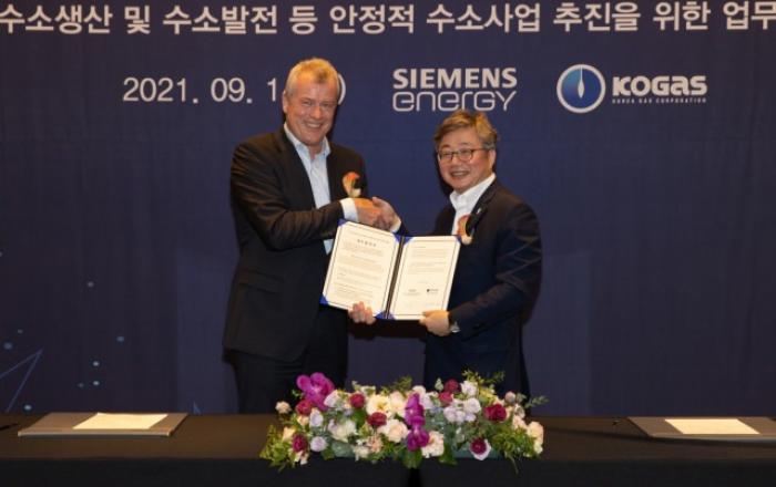 지멘스에너지와 한국가스공사(KOGAS)는 요헨 아이크홀트 지멘스에너지 부회장과 채희봉 한국가스공사 사장이 참석한 가운데, 그린 수소 사업 협업을 위한 업무협약을 체결했다. 이로써 양사는 그린 수소 생산 및 수소 터빈 발전을 위한 전략적 제휴의 시작을 공식적으로 알렸다.