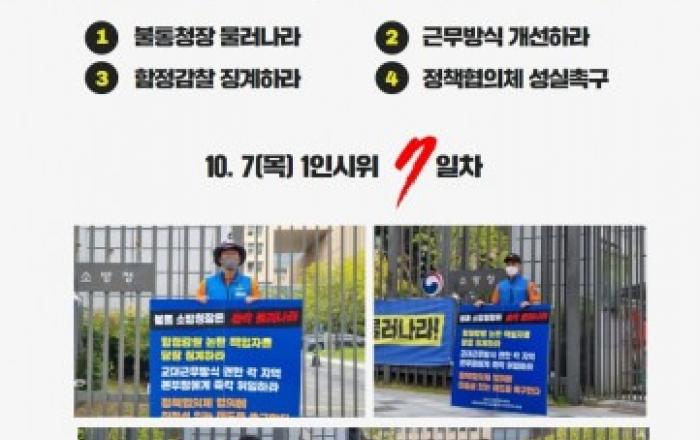 국가공무원노동조합소방청지부(이하 공노총 소방노조)는 “소방청이 소방노조의 요구 사항을 모르쇠로 일관하고 있다”며 릴레이 1인 시위에 돌입했다.공노총 소방노조는 9월 26일부터 총 4가지 조건(△불통청장 물러나라 △근무방식 개선하라 △함정감찰 징계하라 △정책협의체 성실촉