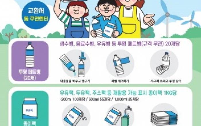 서울 중구는 10월부터 재활용이 가능한 투명 페트병·종이팩·폐건전지를 쓰레기 종량제봉투로 교환해 준다고 밝혔다.재활용품 종량제봉투 교환사업은 종이팩, 폐건전지 등 경제성이 높은 폐자원의 수거율을 높이고 주민이 직접적으로 자원 선순환 활동에 참여할 수 있는 기회를 제공해