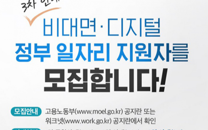 고용노동부는 5일 코로나19로 인한 고용위기에 대응해 하반기에 한시적으로 추진하는 일자리 사업인 비대면·디지털 정부일자리 3차 통합안내를 실시했다. 이번에 공개한 3차 통합안내에는 비대면·디지털 정부일자리 60개 사업 중 17개 사업(6만 8000명)에 대한 사업별