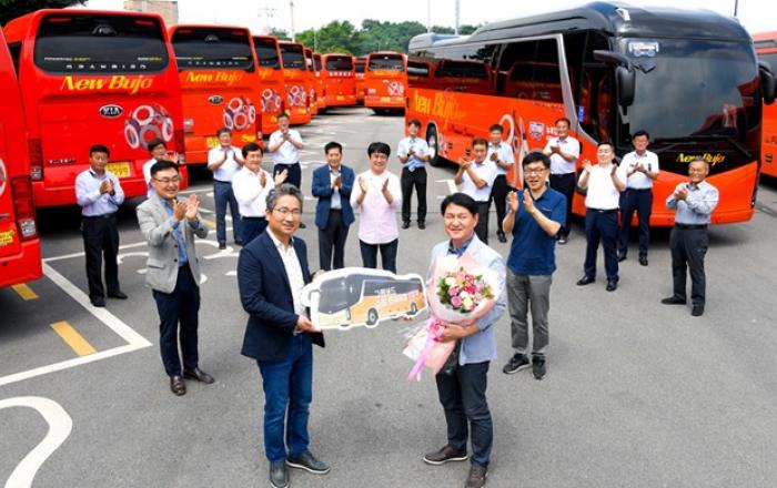 기아자동차가 고급 대형버스 그랜버드의 상품성을 대폭 개선한 ‘그랜버드 슈퍼 프리미엄’의 1호차 전달식을 갖고 본격적인 판매를 시작했다.기아자동차는 16일 경기도 평택시 소재 뉴부자관광 차고지에서 기아자동차 B2B사업실장 윤승규 상무, 뉴부자관광 원동호 대표 등 관계자들