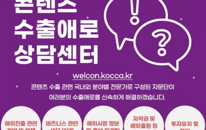 문화체육관광부와 한국콘텐츠진흥원(이하 콘진원)은 정보통신산업진흥원, KOTRA, 한국무역협회, 중소벤처기업진흥공단과 협업하여 코로나19 확산으로 해외진출에 어려움을 겪는 국내 콘텐츠 기업의 애로사항을 해소하기 위한 온라인 ‘콘텐츠수출애로상담센터’를 운영한다.◆ 유관기관
