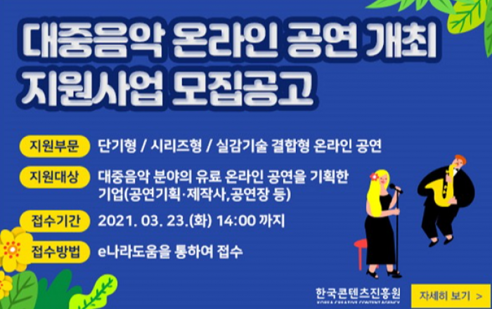 문화체육관광부와 한국콘텐츠진흥원(이하 콘진원)은 국내 음악시장의 확대와 글로벌 시장을 선점하기 위한 차세대 음악 콘텐츠 발굴에 나선다. 콘진원은 올해 음악 지원사업으로 ▲대중음악 온라인 공연 개최 지원사업을 신규 마련했으며, 지난해 신설한 ▲ICT-음악(뮤직테크) 제작