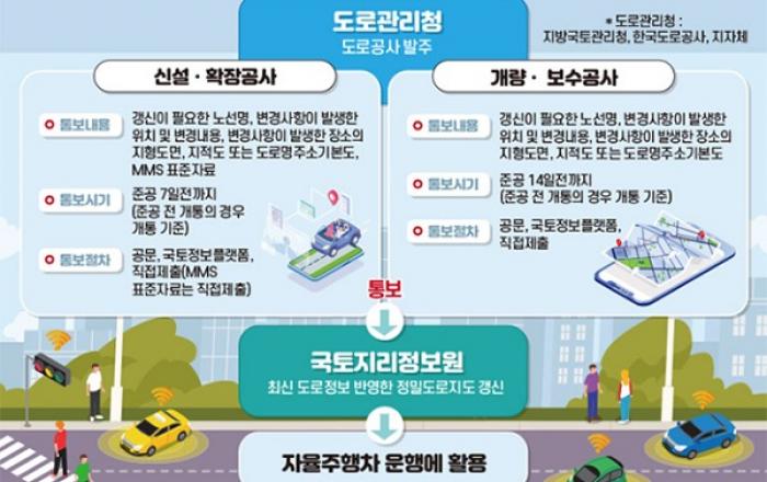 앞으로는 신설·확장·개량·보수 등 도로공사가 마무리될 때 도로 변경 사항이 자율주행차 운행을 위한 정밀도로지도에 즉각 반영된다.국토교통부는 자율주행차 운행에 필수적인 정밀도로지도의 구축 및 갱신을 위해 도로관리청의 도로 변경사항 통보 의무를 구체화하는 내용을 담은 ‘자