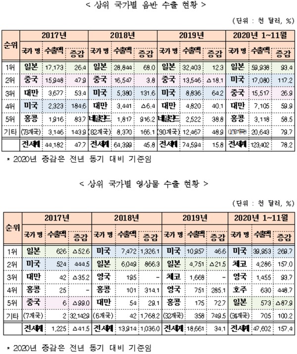 케이팝 음반 최대 수출국은 일본으로 2017년부터 꾸준히 1위 자리를 지켜오고 있다. 올해 수출액은 6000만 달러로 전체 음반 수출액의 48.6%를 차지했다.