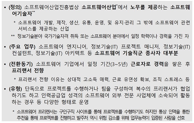 참고로 소프트웨어 프리랜서의 범주는 소프트웨어 개발과 제작, 생산, 유통, 운영, 및 유지·관리 그 밖에 소프트웨어 관련 서비스를 제공하는 소프트웨어산업에서 노무를 제공하는 소프트웨어기술자다.