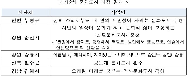 제2차 문화도시로 인천 부평구, 강원 춘천시, 강원 강릉시, 전북 완주군, 경남 김해시 총 5곳이 선정돼 올해부터 본격 지원을 받게 된다.