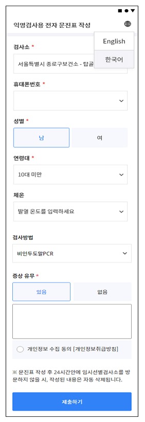 검사 희망자는 전자문진표로 휴대전화 번호·성별·연령대·체온·검사방법·증상·개인정보 수집 동의 여부를 써넣는다.