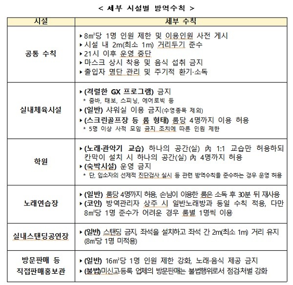 이에 ▲헬스장 등 실내체육시설(줌바, 태보, 스피닝, 에어로빅 등 격렬한 GX프로그램 금지) ▲학원 ▲노래연습장 ▲실내스탠딩공연장 ▲방문판매 등 직접판매홍보관 등은 이용인원제한 및 2단계 공통 방역수칙(마스크 착용, 9시 이후 운영중단, 음식 섭취 금지, 출입자 명단관리)을 적용한 상태로 운영이 가능해졌다.