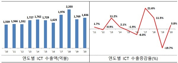 정보통신기술(ICT) 수출이 코로나19 영향에도 불구하고 전년 대비 3.8% 증가하며 역대 3위에 해당하는 수출 실적을 달성했다.