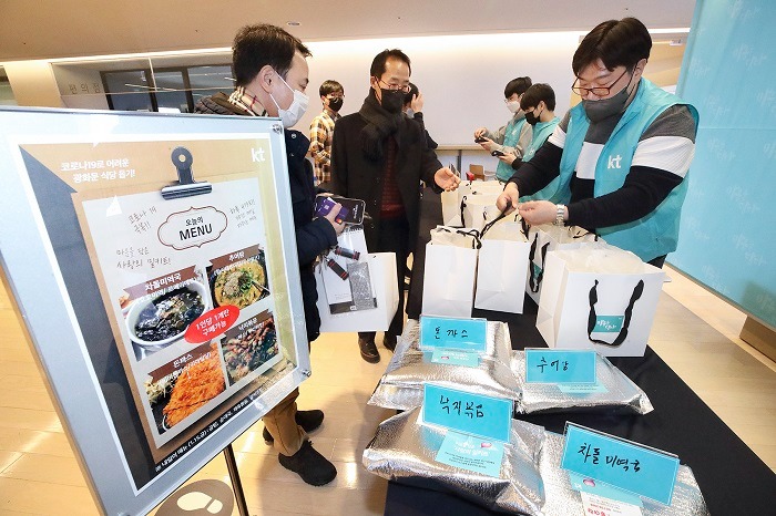 KT는 다음달 2일까지 간편조리로 포장된 밀키트 3천개를 임직원을 대상으로 오후 5시 30분부터 판매한다. 광화문 인근 20개 식당에서 1만원에 밀키트를 구매해서 회사와 직원이 구매 비용을 절반씩 부담한다. 이와 함께 한국중앙자원봉사센터와 협력해 취약 계층에게 1천 500개의 밀키트를 기부한다. 15일간 일평균 300개의 밀키트를 구매해 판매 및 기부한다는 계획이다.