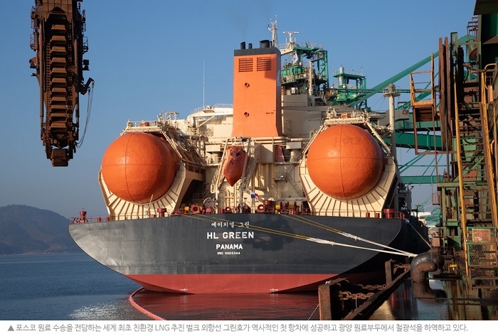 포스코는 국제적 규제에 앞서 선제적으로 지난 2018년 12월 에이치라인해운과 기존 원료전용선 2척을 LNG 추진선으로 대체하기로 하고, 지난해 12월 선박 건조 완료 및 명명식을 거쳐 이날 성공적인 첫 운항을 마친 것이다.