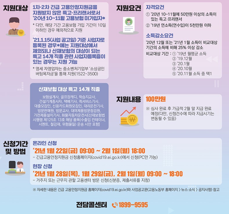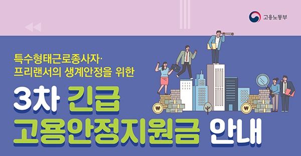 이번 3차 긴급고용안정지원금은 1, 2차 긴급고용안정지원금을 지원받지 않은 일정 소득 이하의 특수형태근로종사자(이하 ‘특고’)·프리랜서 중 코로나19로 소득이 감소한 경우 최대 100만원을 지원한다.