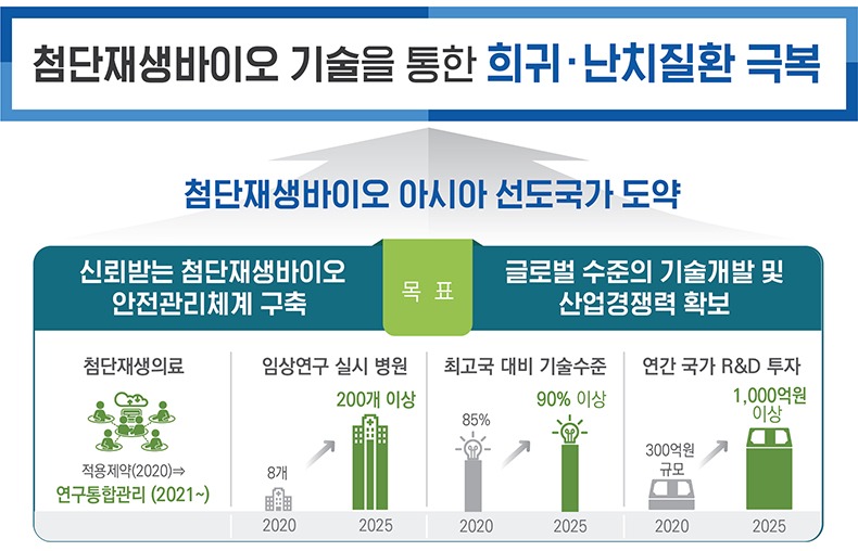 국가 연구개발(이하 ‘R&D’) 투자를 대폭 확대, 10년간 5955억 원 규모의 국가 R&D 투자를 추진해 첨단재생의료 분야 전주기 기술발전을 지원한다.