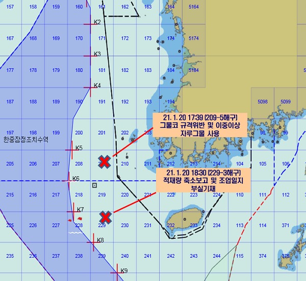 해양수산부 어업관리단의 지도선이 나포한 중국어선은 규격보다 촘촘한 그물을 사용하여 어린 물고기 등 수산물을 불법 포획하거나, 적재량을 축소 보고하고 조업일지를 허위로 기재한 혐의를 받고 있다.