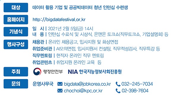 아울러 5일 개최일에는 실시간 ‘빅데이터 일자리 토크쇼’를 통해 청년들의 취업관련 궁금증 해소에 나서는데, 데이터기업 재직자·인사담당자 등이 참여해 취업 경험담을 공유하고 청년들과 온라인으로 실시간 질의응답 시간을 가질 예정이다.